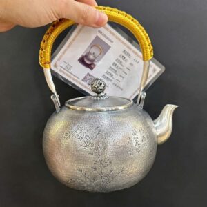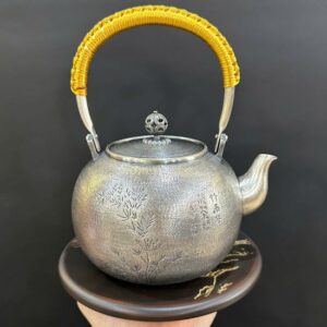 Ấm bạc đun nước pha trà nguyên chất 999 dạng tetsubin khắc trúc gò tay thủ công 1L.