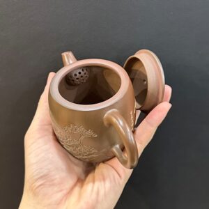 Ấm trà tử sa dáng chuông gốc tùng khắc sơn thủy hỏa biến 250ml AKC68