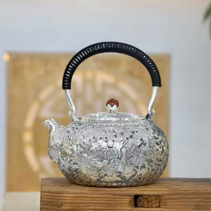 Bộ ấm pha trà bạc nguyên chất 999 gò tay thủ công hoa mẫu đơn đẹp AB86