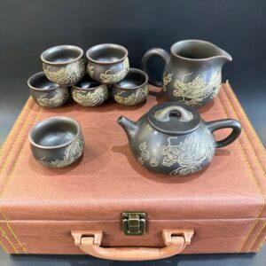 Bộ ấm trà hình rồng tử sa nê hưng cao cấp thủ công hộp da AT96
