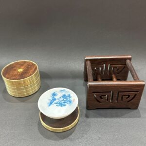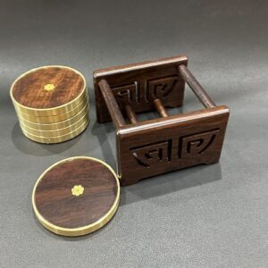 Hãy là người đầu tiên nhận xét “Bộ lót chén trà cao cấp gỗ gụ viền đồng vàng dáng tròn LC40”