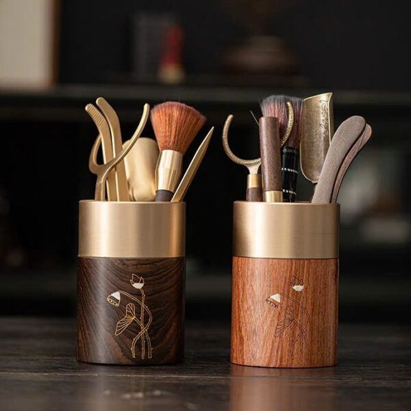 – Chất liệu: Ống cắm Gỗ Hương, các dụng cụ cán gỗ, đầu mix inox vàng đồng