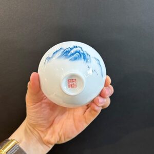 Chén trà sứ cảnh đức vẽ tay thủ công sơn thuỷ dáng nón đẹp tam long giáng ngọc 70ml.