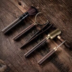 – Các trà cụ: Ống đựng, xúc trà, gắp chén, chổi, dâng chén, dao tách trà bánh