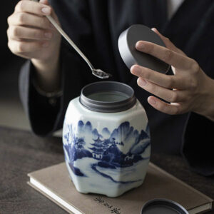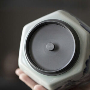 Hãy là người đầu tiên nhận xét “Hũ trà sứ cảnh đức lục giác sơn thủy nắp kín bảo quản trà 800ml HT32”
