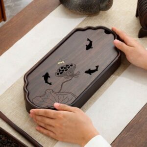 Hãy là người đầu tiên nhận xét “Khay đựng ấm chén bằng gỗ gụ dạng hộp cỡ nhỏ hình sen cá 32x15cm KTG13”