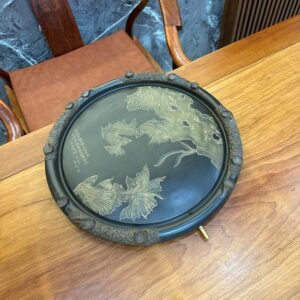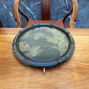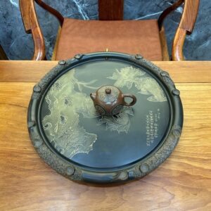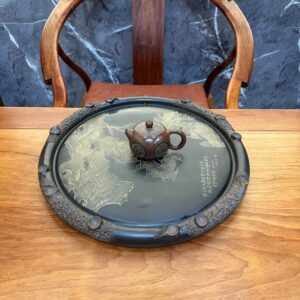 Hãy là người đầu tiên nhận xét “Khay trà để ấm chén dáng tròn tử sa nê hưng hỏa biến ngũ ngư 43cm KNH20”