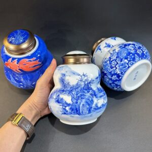 Hãy là người đầu tiên nhận xét “Lọ đựng trà sứ cảnh đức giang tây dáng hồ lô vẽ tay 800ml HT85”