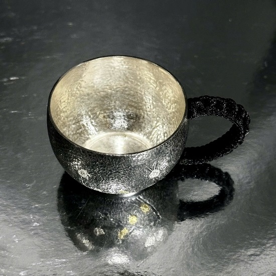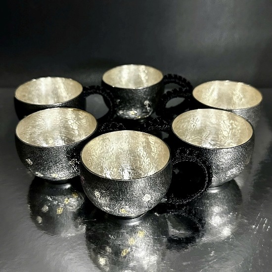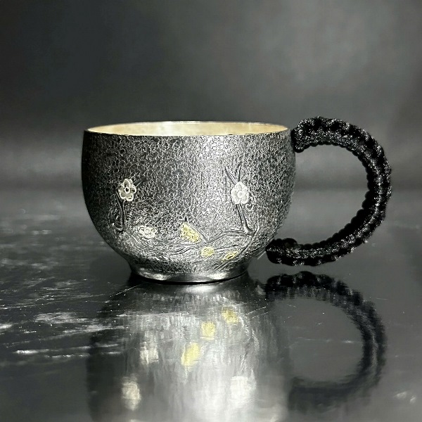 Ly bạc uống trà nguyên chất 999 gò tay thủ công hoa mai cao cấp 45ml CB84